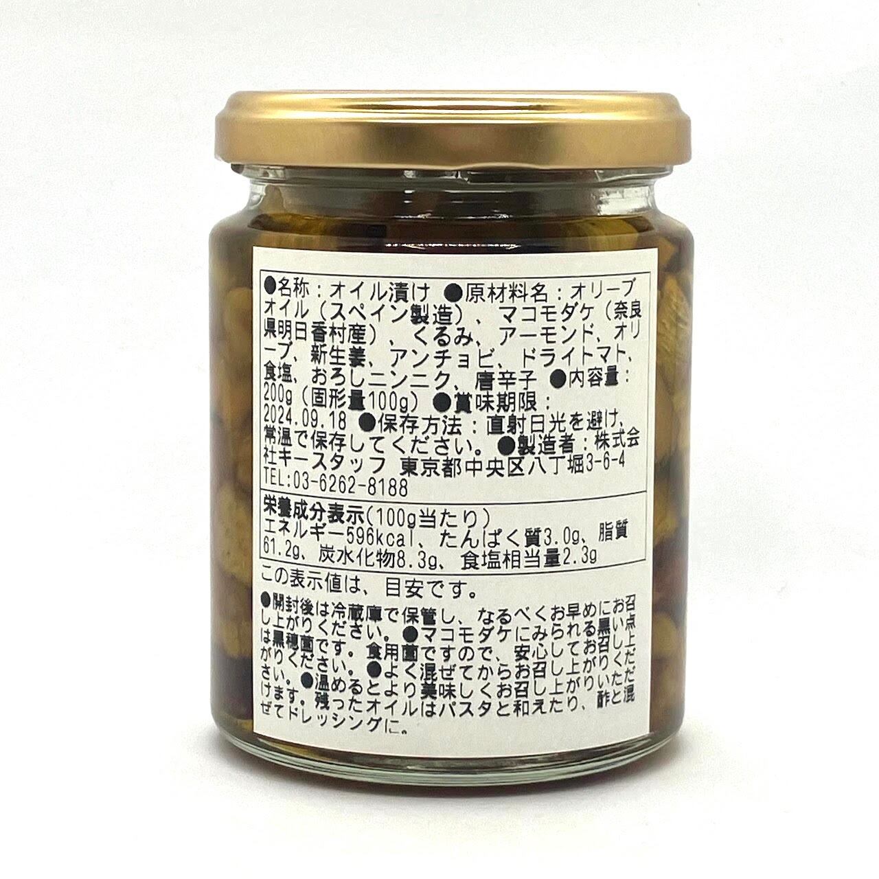 ◯原材料名:オリーブオイル(スペイン製造)、マコモダケ(奈良県明日香村産)、くるみ、アーモンド、オリーブ、新生姜、アンチョビ、ドライトマト、食塩、おろしニンニク、唐辛子