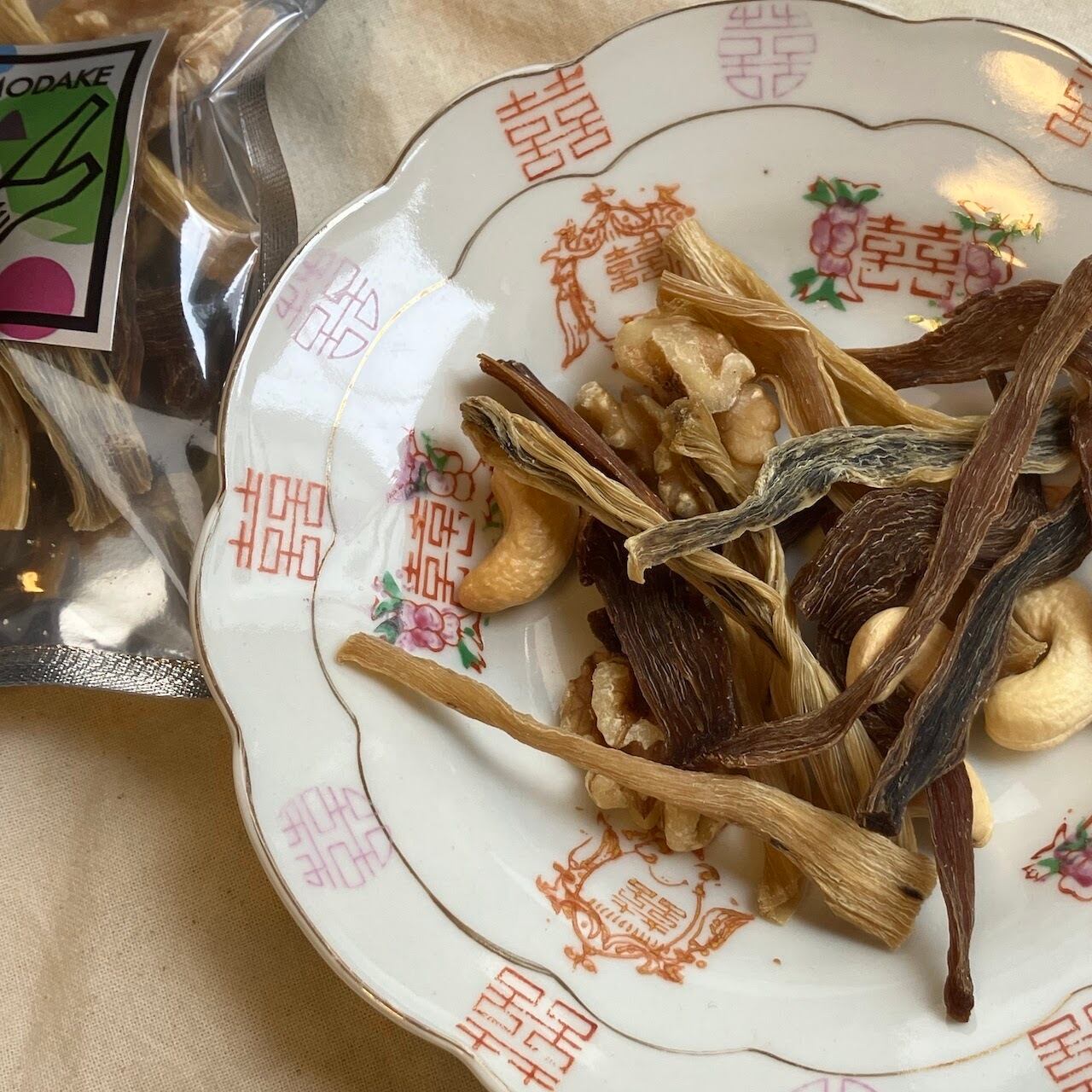 マコモダケを味付けして乾燥したジャーキーです。くるみやカシューナッツなど、食感の楽しいナッツと組み合わせました。